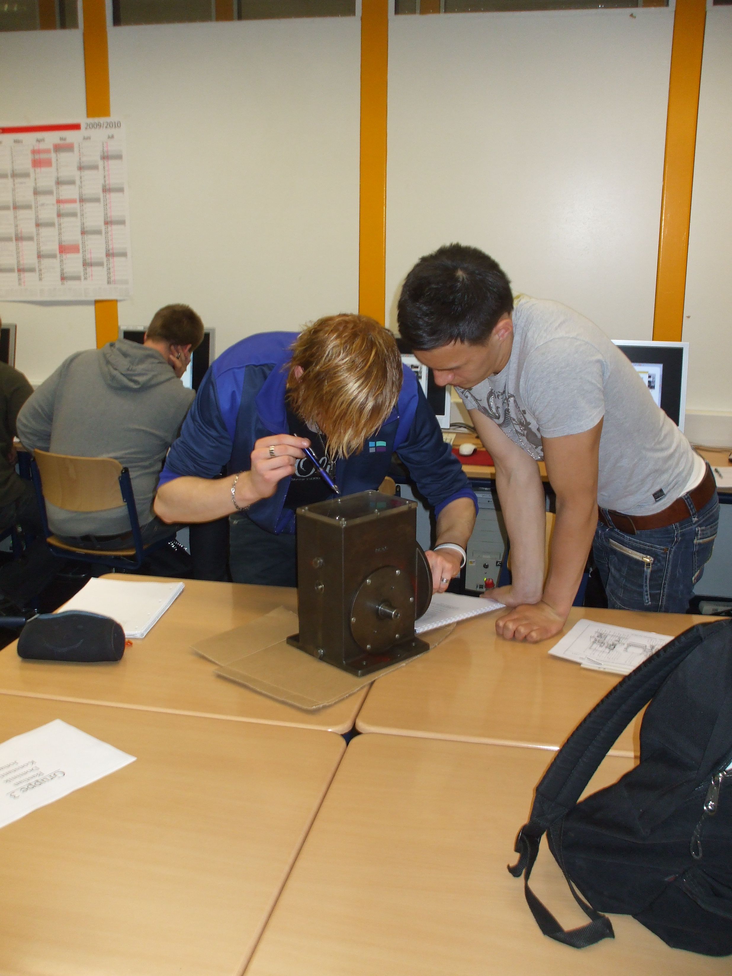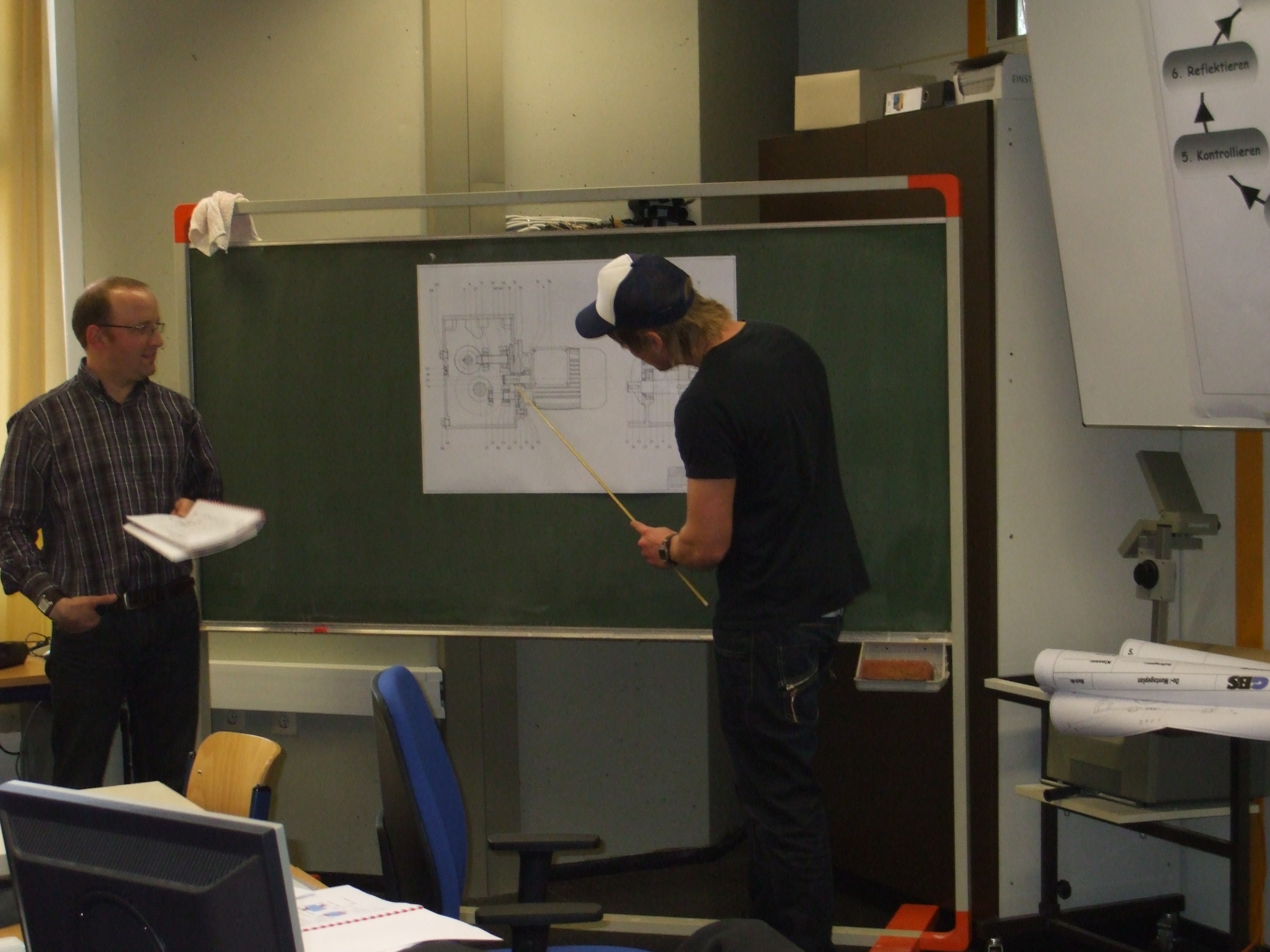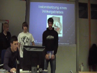 Die genaue Funktionsweise des Getriebes wurde mit Hilfe einer technischen Zeichnung, durch einem Schüler, allen Gruppen noch einmal verdeutlicht. |