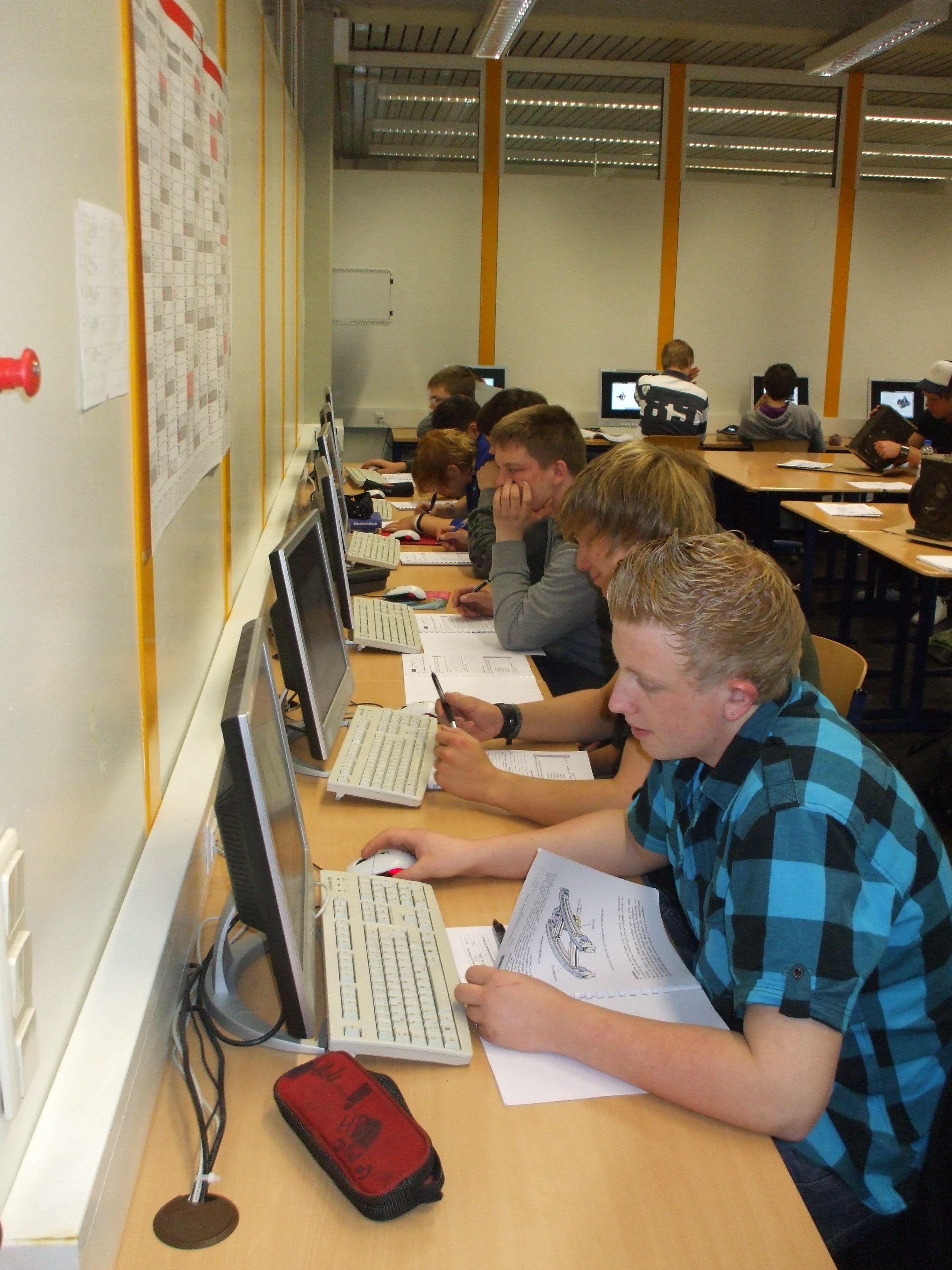 Es wurden insgesamt 6 Gruppentische aus einzelnen Tischen zusammengestellt. Diese wurden in die Mitte des Raumes plaziert. Jede Gruppe erhielt ihr eigenes Winkelgetriebe. An den drei Wandseiten des Raumes waren insgesamt 19 PC-Arbeitsplätze angeordenten. |